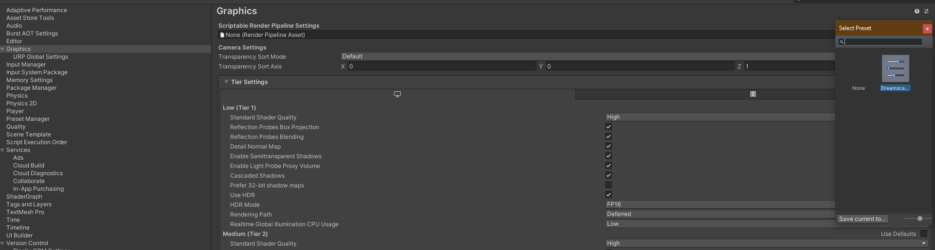 Open your Project Settings and go to the Graphics Tab. From there go to the right of the window and click on the Settings Icon ( to the right of the ? icon). From there select the DreamscapeVillage_GraphicSettings.