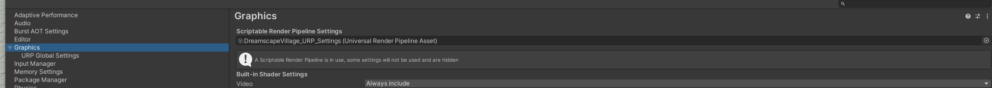 In the case of URP, the URP settings are also included. In order to set them up, go to Project Settings/ Graphics and in the Scriptable Render pilepile Settings Select DreamscapeVillage_URP_Settings